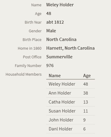 Wiley Holder was born 25 April 1812 in Duplin County North Carolina. He moved to Cumberland County North Carolina in the 1830's. Wiley is first seen on a land deed in 1835. Next he is listed in 1841 as owing back taxes on his land. In 1845 Wiley is a witness for a court case. In 1846 Wiley has a marriage bond to Ann Blanchard. In 1850 Wiley is on the Census with wife Ann. Wiley in 1848 is selling land to his brothers Ithra and Jacob. In 1848 he is buying land to build a mill with his brothers. In 1860 and 1870 Wiley and Ann are again on the census records as living in Barbecue Harnett North Carolina. 1880 Census shows Wiley and his second wife Catharine living in Barbecue Harnett North Carolina. Wiley dies 2 June 1888 in Barbecue Harnett and is buried in the Holder family cemetery.